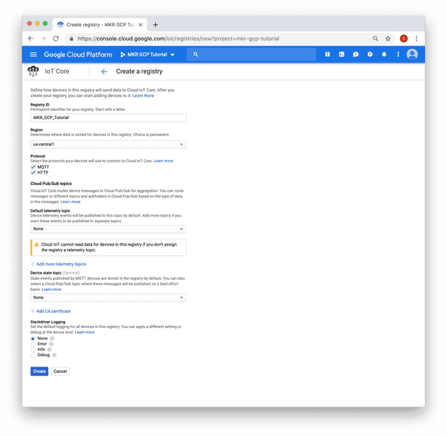 Once the API is enabled, you will be prompted to create a device registry.